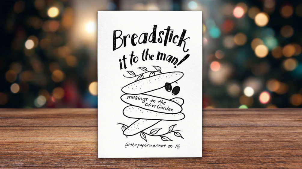 Breadstick it to the Man! is a heartfelt, hilarious mini-zine all about the unexpected magic of the Olive Garden. What starts as a childhood memory — inspired by a Wall Street Journal article — turns into a warm, witty reflection on family, class, and the joy of sharing endless breadsticks under the glow of 90s chain restaurant lighting.